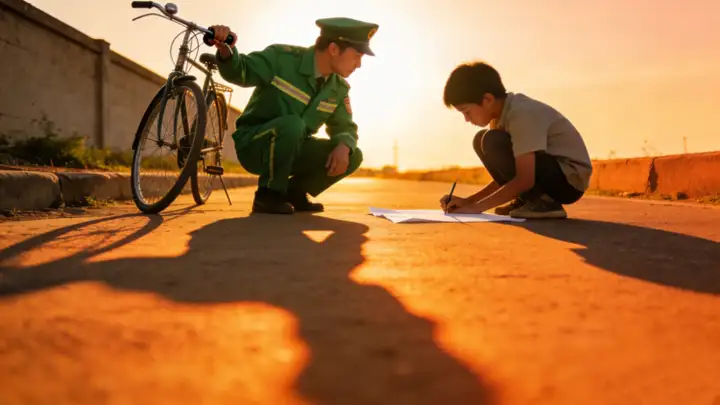 穿绿制服的他捏住车闸,帆布邮包鼓鼓地垂在车后。他看了很久,久到西斜的日头把他影子拉得老长,完完全全罩住了我和那张皱巴巴的纸。