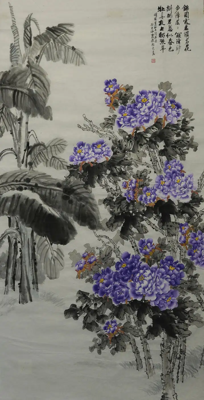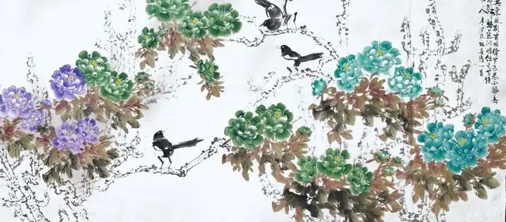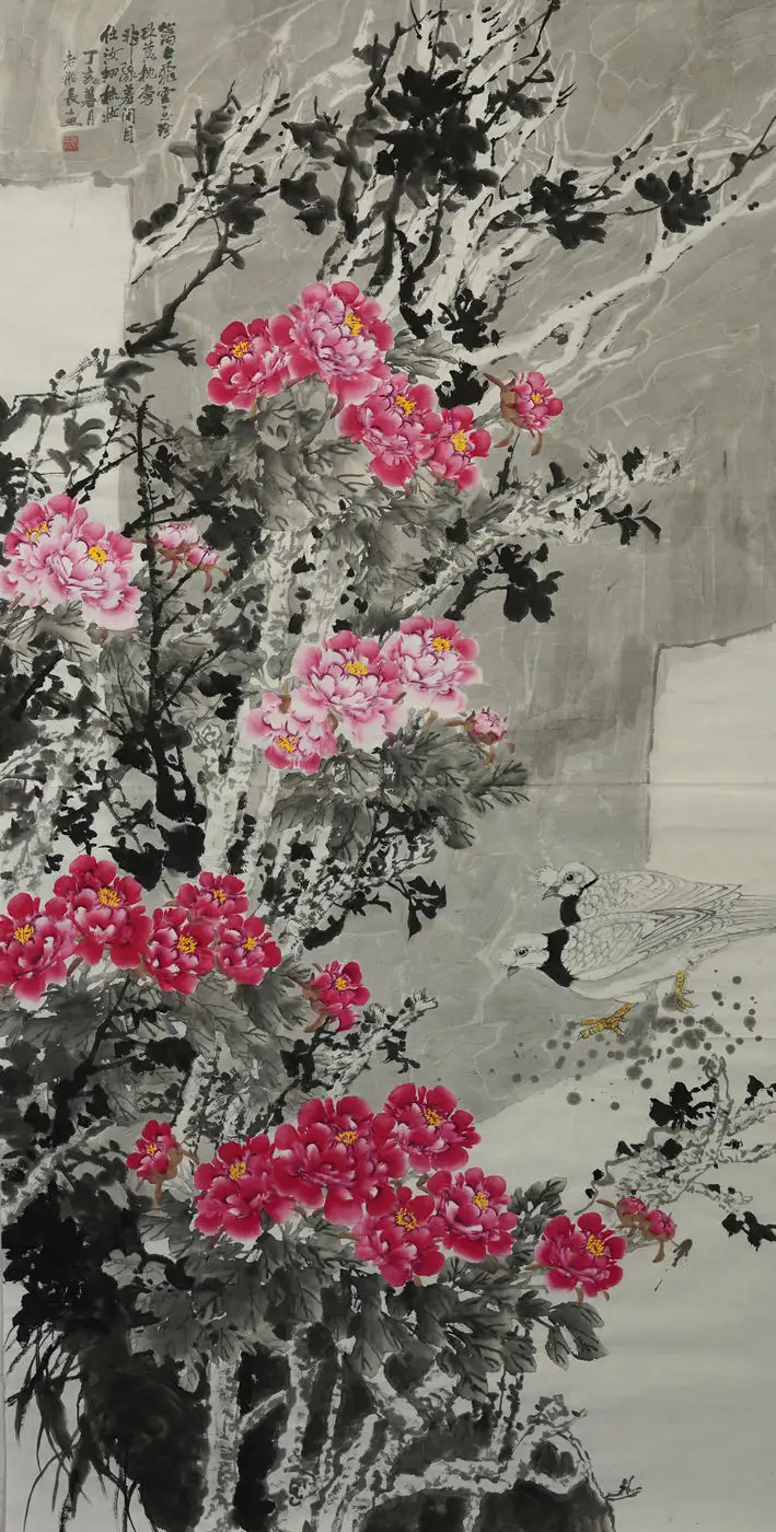 王家华先生是一位有造诣的画家。在中华民族传统文化的创作领域中,名家大师大多习惯于用意象来构建意境,例如梅、兰、竹、菊等等。而王家华先生则对牡丹花情有独钟。牡丹花素来被誉为“国花”,色彩丰富、雍容华贵,深受国人的喜爱,也是中国花鸟画中最常见的表现题材,最早可追溯到北齐时期。唐代韦绚在《刘宾客嘉话录》中说“北齐杨子华画有牡丹”,这是关于牡丹绘画的最早记载。牡丹已被历代画家演绎了1500多年,每个时期的牡丹都有各自的风格,不同的文化内涵,在众多牡丹艺术的代表作中,既有展示庙堂之高的夺目奢华,也有反映志节高远的“水墨丹彩”,既有富商巨贾的大红大紫,也有闲云野鹤的清淡人生。